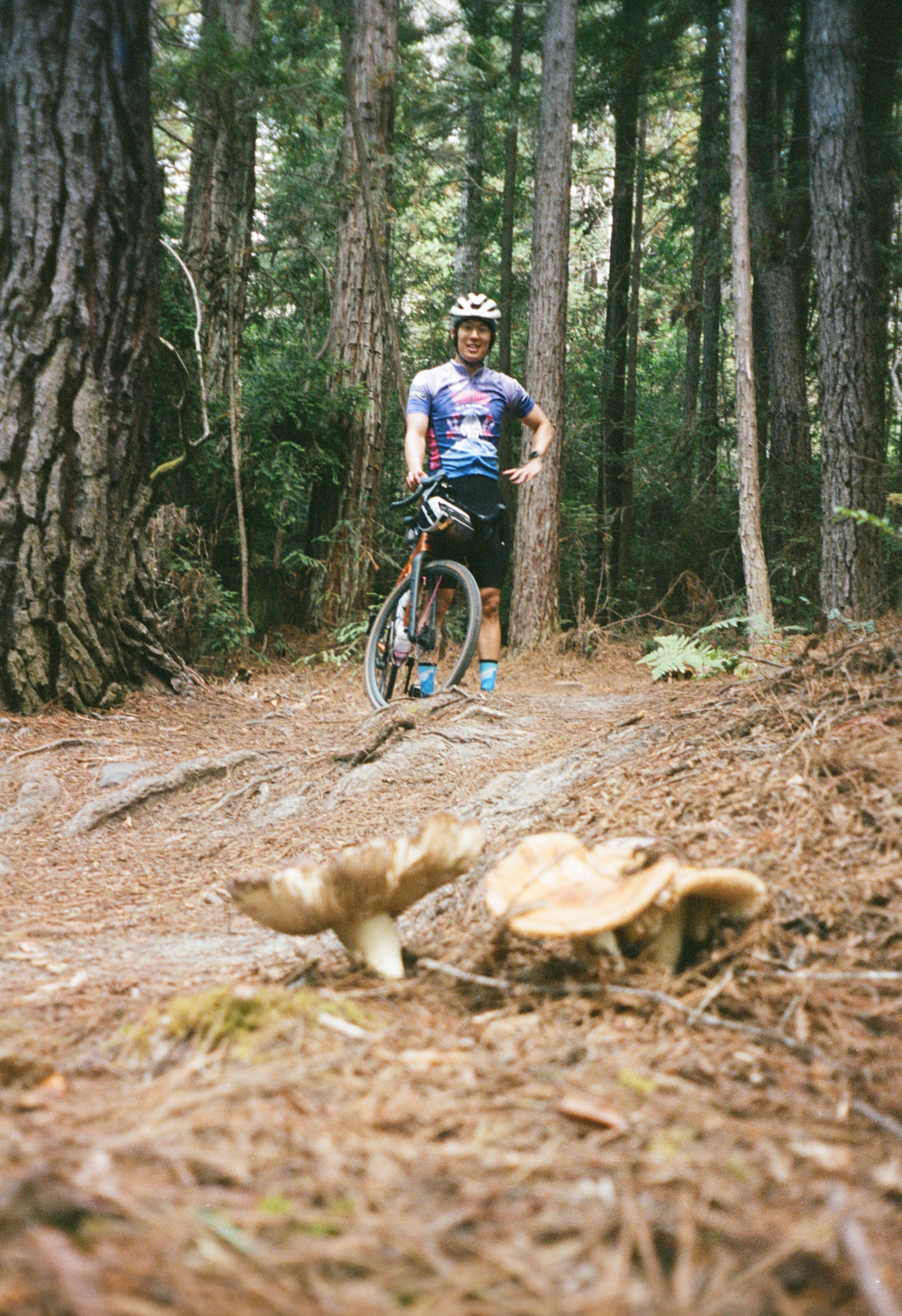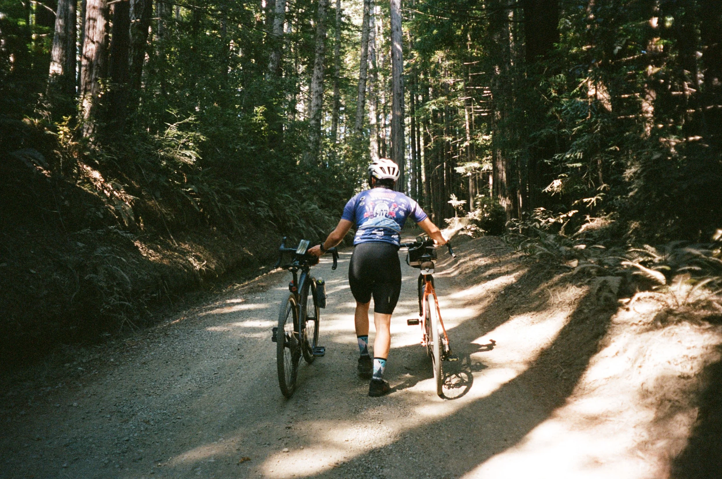 Day 2 was Mendo Gravel Camp. We stocked up on some sandos in town, then made our way to the Jackson Demonstration State Forest. On the climb up, we alternated between fire roads and narrower trails through the trees. Since we’re still in our beginner gravel phase, whenever we couldn’t make it up a hill or over some roots, we hopped off and hike-a-biked.