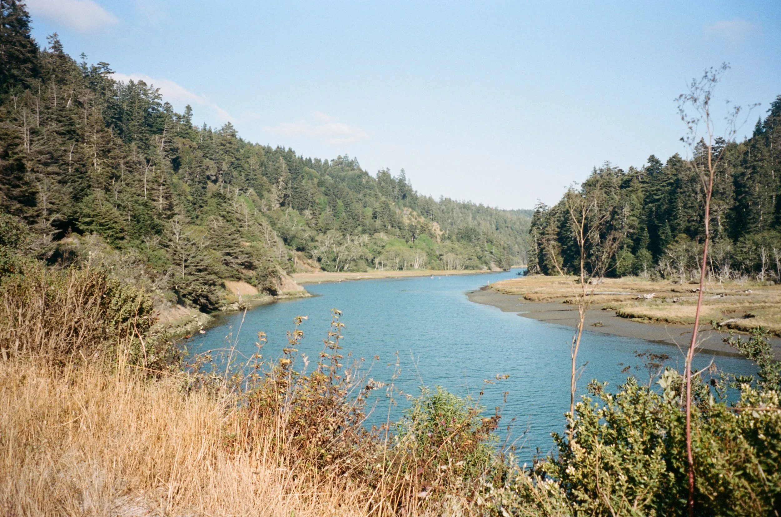 While descending, we missed the turnout for Observatory Hill Trail. I was hesitant to go back up, but William convinced me by pushing both of our bikes uphill while I snacked on a Cajun chicken sando. We found the trail, and wow—it was worth the backtrack. There were flowy ups and downs with berms, the ground was full of soft-packed dirt, and we entered our flow state. We popped out and rode cobbles down to the Big River. That river portion was serene, flat, and long. Near the end, we hustled so we could sneak in a dinner at Princess Seafood in Fort Bragg.