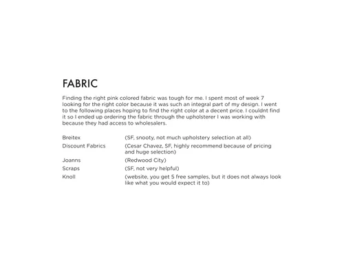 With the intention of creating a creamy, sturdy, sassy chair, this chair is meant to be a place where I can pause, take a break, and breathe. Through the smooth solid cherry frame and plush pink cushions, the chair has a playful, inviting softness to it. The chair is intentionally short in order to fit my petite figure. Similar to guavas, this chair is small, sturdy, and sweet.